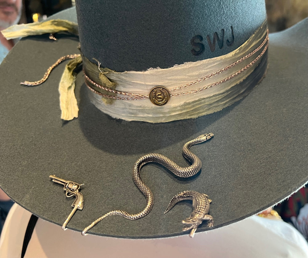 A collection of hat jewelry and pins for men and woman that can adorn a hat to a tie. 18K Gold, silver, turquoise and a variety of natural stones- this array is authentic, high quality and timeless to keep your hat looking as classy as you. Hat sliders that slip on to your hat and give it charm and a personality.