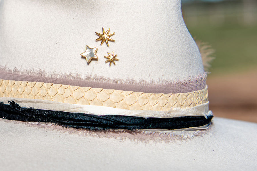 Hand carved and cast, Mother of Pearl Star pin, set in gold plated over recycled sterling silver. Pin backing to secure onto a hat, tie or lapel. Mother of Pearl Star is on the bottom left, paired with the medium and small starburst.